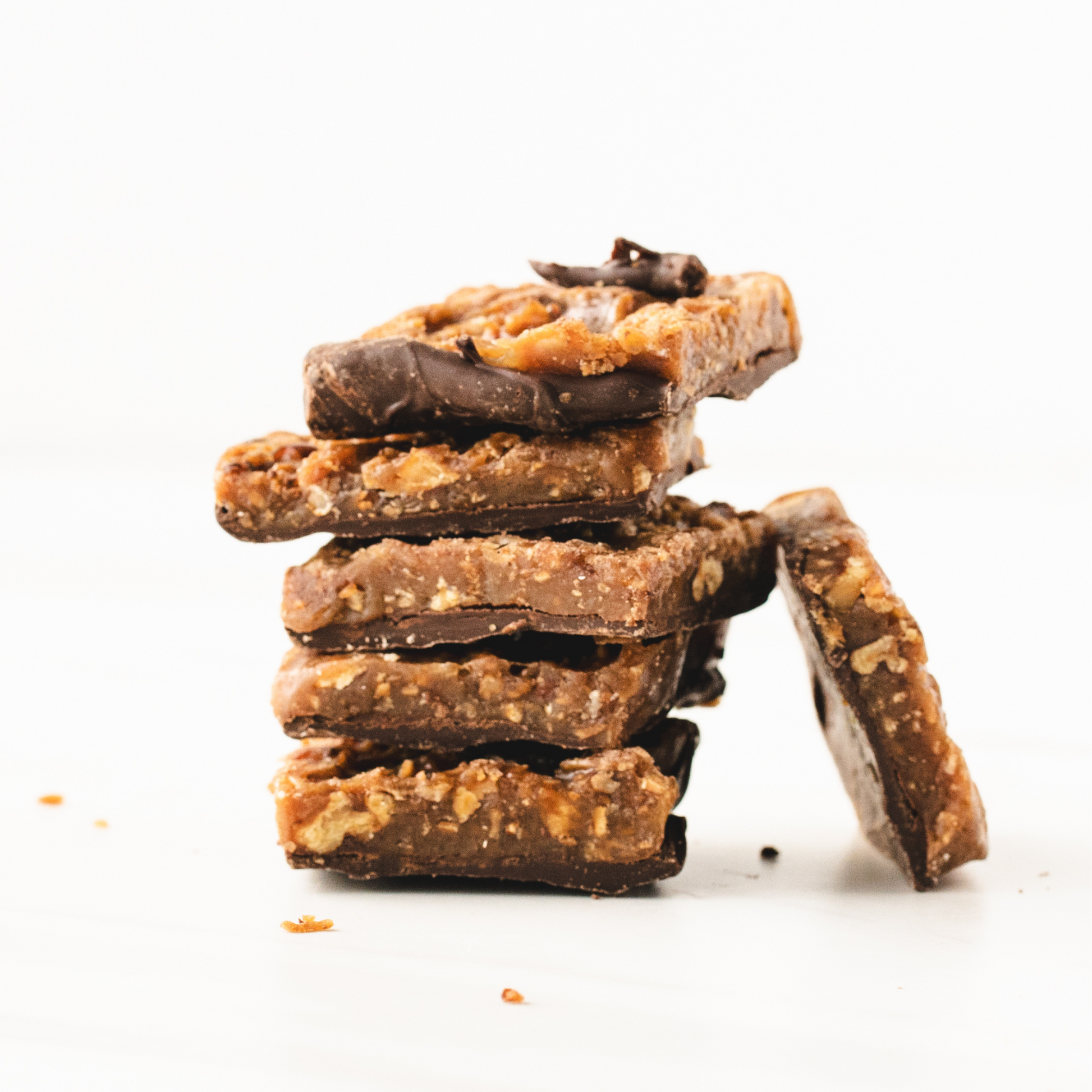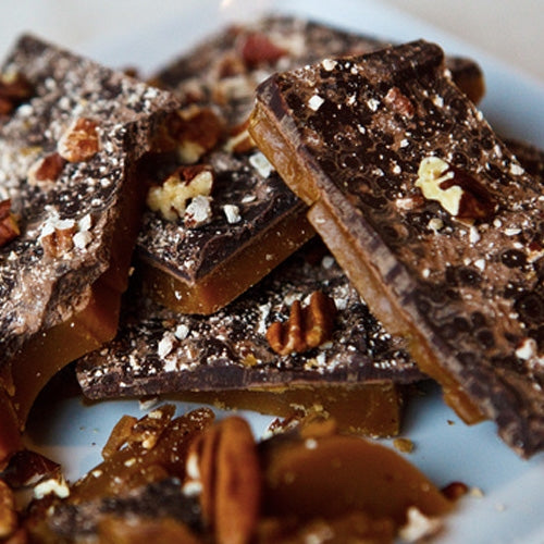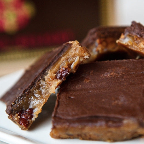 I created this after discovering that sometimes when our German Chocolate topping overflowed and baked on the pan it was simply delicious… so I baked it in a pan and covered it with chocolate. The result is a very unusual, very delicious, soft chewy candy. Comes beautifully packaged in our tin.