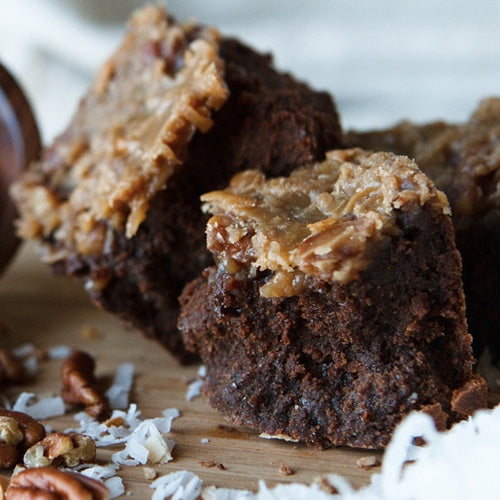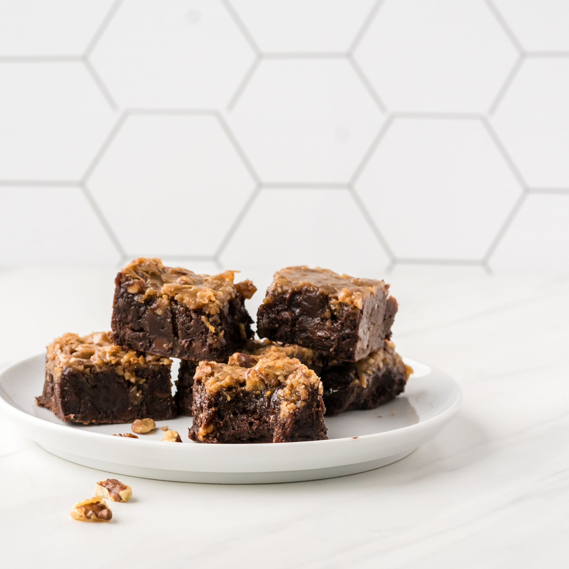 I start with my Classic Chocolate brownies, and top them with a rich, caramel crust that’s loaded with fresh coconut and pecans. The result, a batch of delicious, buttery German Chocolate brownies.