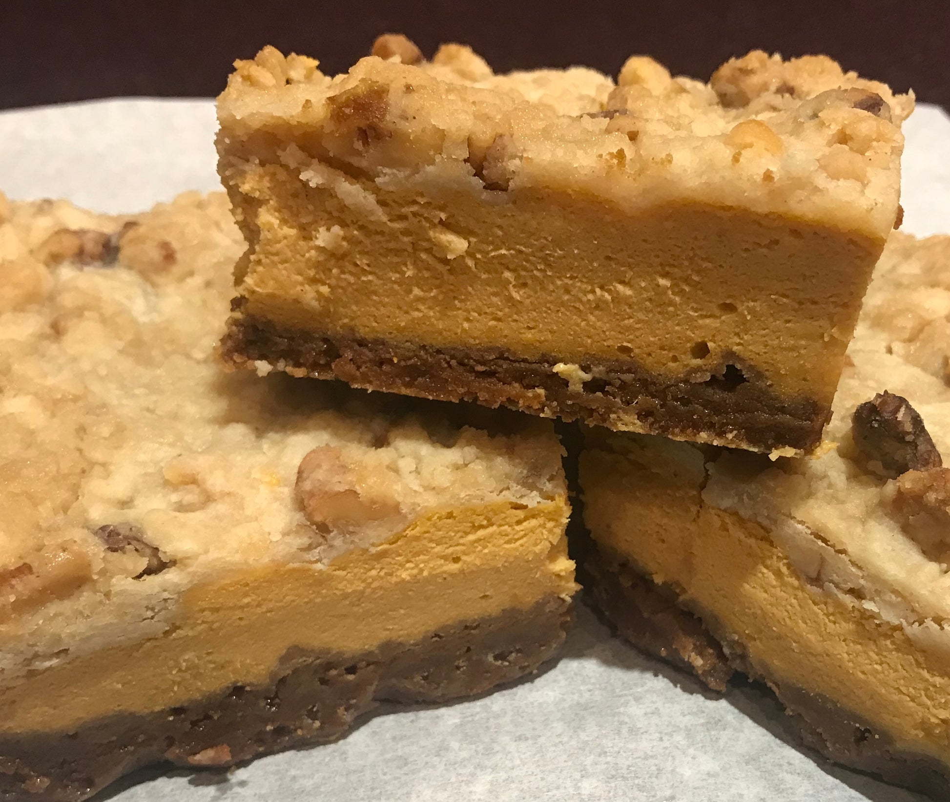 November 11th: Pumpkin Crumble Bars-The crust is a Biscoff Cookie crust with a healthy dose of Ginger, topped with a Luscious Pumpkin Cream Cheese Mixture and covered in a Pumpkin Spice-y, Buttery, Crumble-- spiked with Toasted Walnuts!